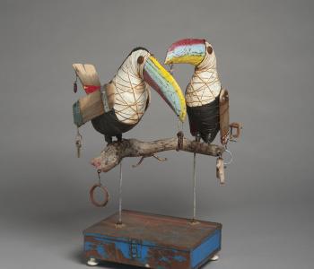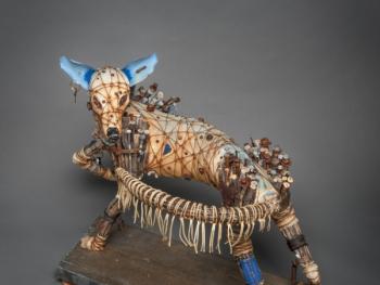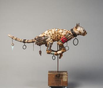 Despite their inorganic skeletons and accoutrements, Gorman’s animals are very much alive. He creates vivid stories around and imagines interactions and relationships among his animals. They have thoughts, feelings, motives and desires – just like humans. Despite the feral appearance of his animals, the agency he ascribes to his sculptures makes them highly anthropomorphized. With the stories he builds around his creations, Gorman treads a paradoxical line between the wild animal and the human animal. Or perhaps he erases any divide at all.