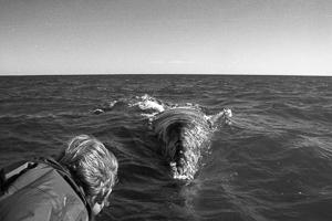 What if this species were actually telling us something much deeper than what we normally think they can communicate? That these whales could have gone extinct makes the case for their outreach all the more compelling. At the height of factory whaling, their numbers plummeted to only a few hundred. Given a reprieve, their population numbers started bouncing back, and now the world has more than 20,000 of them. Never the less, we could have caused their extinction and with it, the loss of perhaps the most rarefied human-non-human ritual on the planet. For through this ritual, a symphony is extended to us when the whales breach, come up to a panga, stick their massive heads out of the water and eye the human experiment. Some whales stay long enough to allow us that extension of the hand, which says that deep down in the central core of time and memory, we are all the same. They know our kind and our unkindness and what we are capable of, and yet still they come. Through this act of commiseration, compassion for the havoc we represent to this life force, the whales are telling us something critical for our sanity and survival. They are saying, "We know who you are and what you have been. You have been forgiven... learn now who we are."